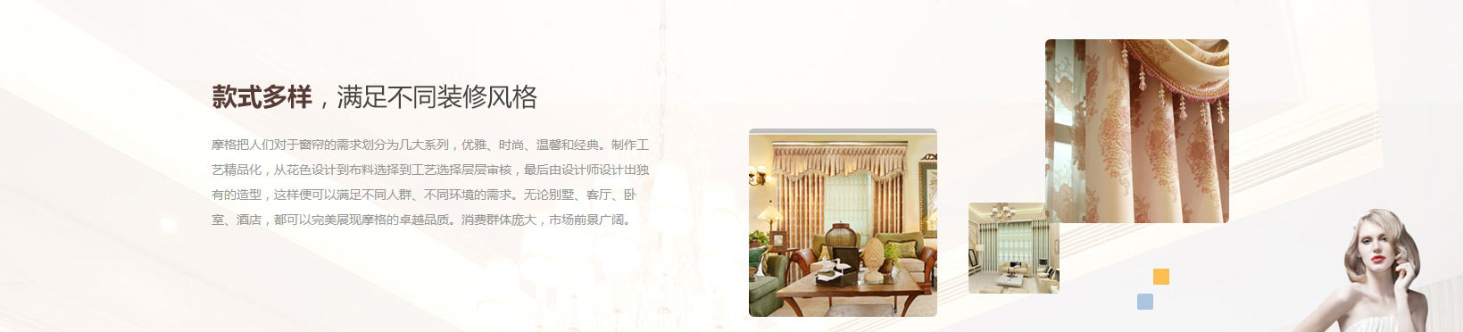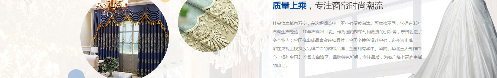 取源于中華悠久紡織文化的摩格(MOONGOOL)品牌,始終堅持“健康、時尚、精致”的產(chǎn)品觀,引領(lǐng)軟裝布藝行業(yè)進(jìn)入高品質(zhì)生活。產(chǎn)品設(shè)計風(fēng)格融入歐式低調(diào)奢華元素及國際流行時尚趨勢,先后開發(fā)了古典巴洛克、簡約洛可可、經(jīng)典中式(新中式)、時尚地中海、浪漫田園、唯美美式、原木風(fēng)、奶油風(fēng)、現(xiàn)代簡約風(fēng)九大風(fēng)格系列產(chǎn)品,擁有各種花型、工藝、材料面料達(dá)1500余種。其中窗簾產(chǎn)品作為摩格核心產(chǎn)品頗受消費(fèi)者青睞。采用高精密、棉麻、雪尼爾等上千種布料的摩格窗簾用高端的新興工藝制作,絨面柔軟,織物華麗,九大截然不同的風(fēng)格同時搭配種類繁多的布類花型和不同的制造工藝,顏色或艷麗或素雅或大氣,簡約而不簡單。無論哪一款窗簾,都在注解不一樣的故事,也詮釋著自己的絕佳格調(diào)。正因?yàn)槿绱耍瑐€性獨(dú)特和創(chuàng)新思維賦予摩格更多的市場商機(jī)。